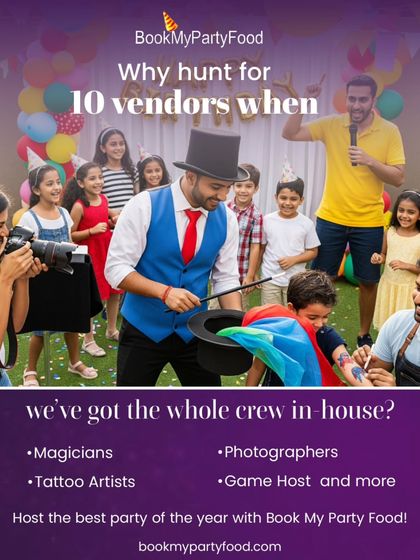 We’re BookMyPartyFood, and honestly, we just get a kick out of a good party. We saw too many hosts missing the fun, so we jumped in - food, games, magic, decor, all sorted. Watching kids laugh at a magic show or seeing a client finally chill at their own bash, that's our jam. Whether it’s a Mehendi, first birthday, or a big office event, we bring the food and the fun. We don’t just cater, we make memories.