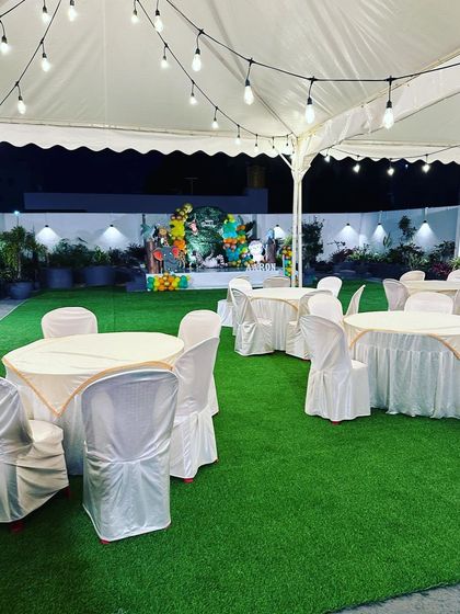 Our private, fully enclosed outdoor party venue in Kothanur is the perfect solution for your event. It features clean artificial turf, can be fitted with large tents, and transforms into a magical space with string lights for evening parties.