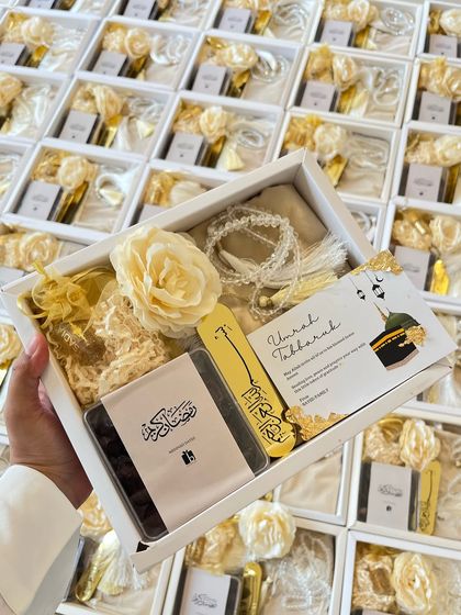 For sacred occasions like Ramadan, Eid, Hajj, and Umrah, I curate gift hampers that are both beautiful and meaningful. These boxes can include items like prayer essentials, gourmet dates, and attar, perfect for gifting or as return favors.