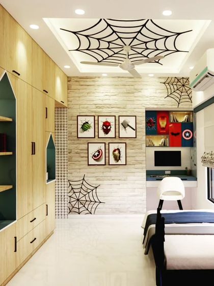 - Kids Room: Theme-based design (e.g., Avengers/Princess) with digital print laminates, study desk, and trundle or storage bed.