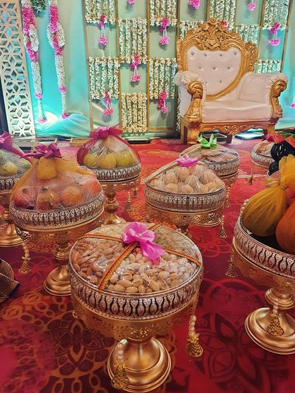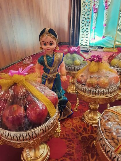 We design and set up custom ceremonial platters for South Indian events, using themed displays with miniature dolls, decorated coconuts, and gold or silver platters to create a full stage setup that matches your family’s traditions.