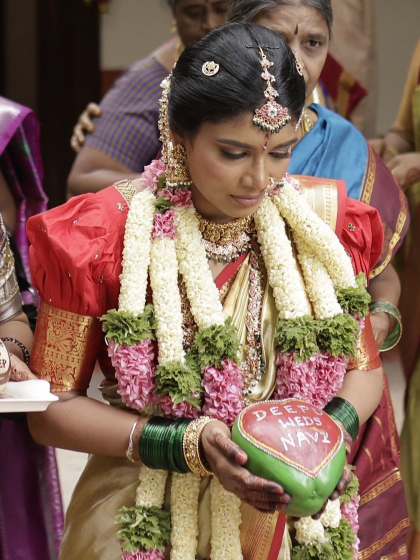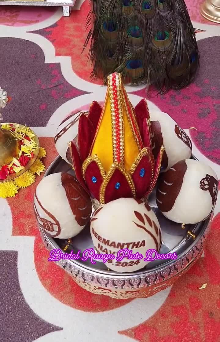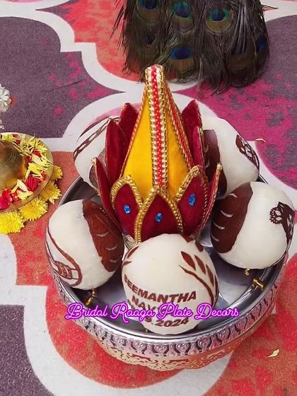We add a personal touch to traditional offerings with our decorated coconuts and thamboolam platters. We provide hand-painted coconuts with event names or motifs like Lord Krishna, and create beautiful kalasha displays in lotus shapes.
