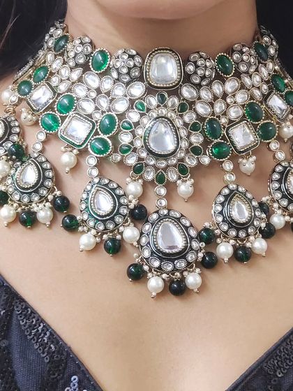 - Necklace: 1 Single tier Choker or Short Necklace (American Diamond, Gold-plated Kundan, or Pastel beads).