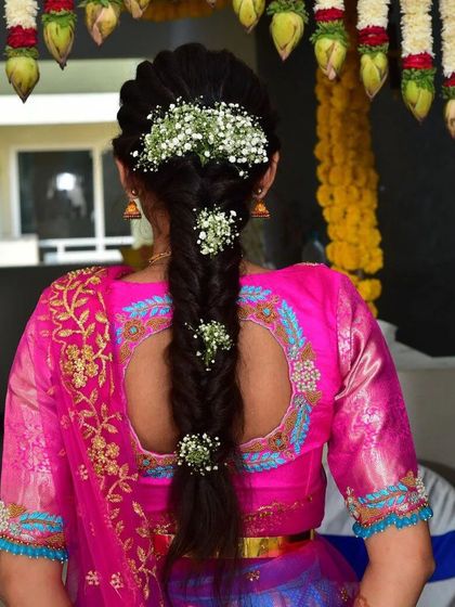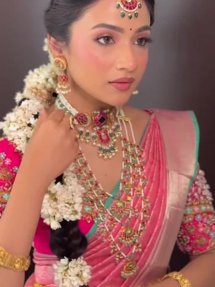 I design complete ensembles, from classic South Silk sarees with matching blouses to bespoke engagement lehengas. We can work with any color palette and style to create a cohesive look that is entirely your own, ensuring your outfit is perfect for any wedding event.