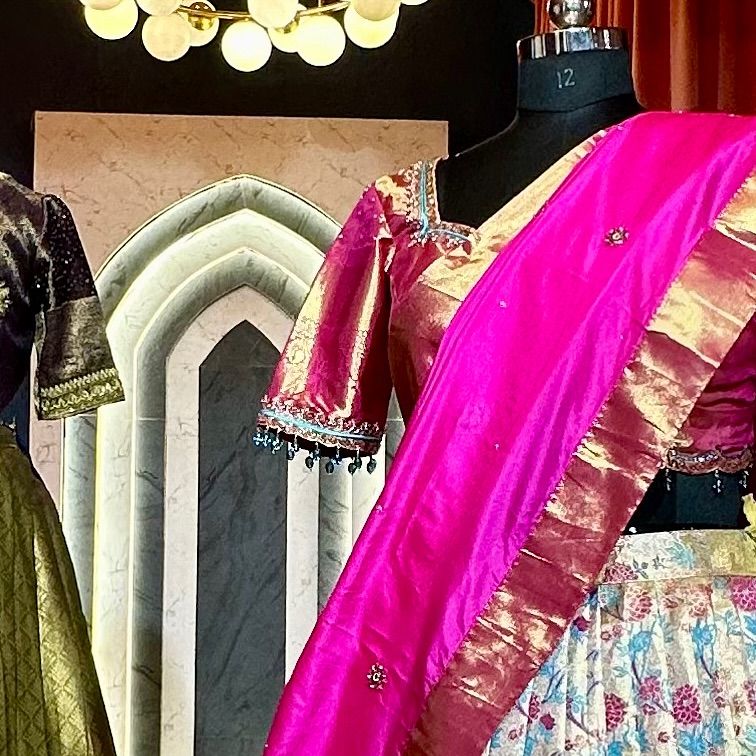 I love transforming traditional silk sarees into stunning lehengas, perfect for engagements, sangeets, and receptions. Each saree lehenga is custom-stitched for a perfect fit and paired with a beautifully hand-embroidered blouse to create a complete, unique outfit.