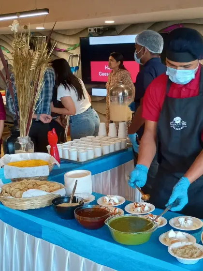 Elevate your corporate event with our live food stations. We offer options like fresh salad bars and street food counters, such as chaat, where our chefs prepare and serve food to your guests, adding an engaging and fresh element to the dining experience.