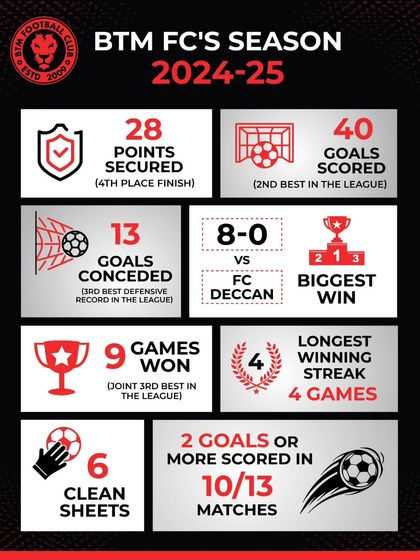 We’re BTM Football Club - the Red Lions. Started way back in 2009, always fighting, always coming back. Sixteen years for our first final, and man, that win felt like magic. Not always easy, we’ve had our share of heartbreaks, but Vega, Shaurya, Vijaya - that’s our spirit. Through Rush Academy, we see kids grow, some even making it to ISL clubs. Feels good, being more than a team. We’re family. Football’s our passion, always will be.