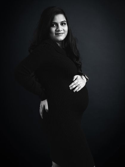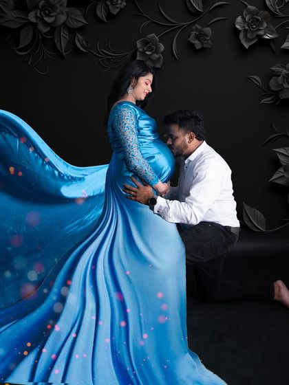 I do maternity shoots in my Akshayanagar studio with different styles like boho, dramatic portraits, silhouettes, and painting-style saree photos, provide gowns in all sizes, and include family, kids, or pets if you want.