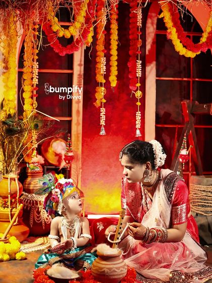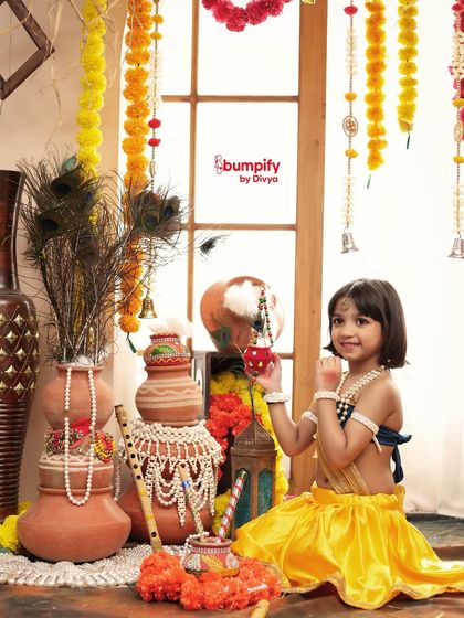 - Krishna Janmashtami baby photoshoot - Little boys dressed as Kanha, girls as Radha, full props like matki, pagdi, flute, and classic jhula.