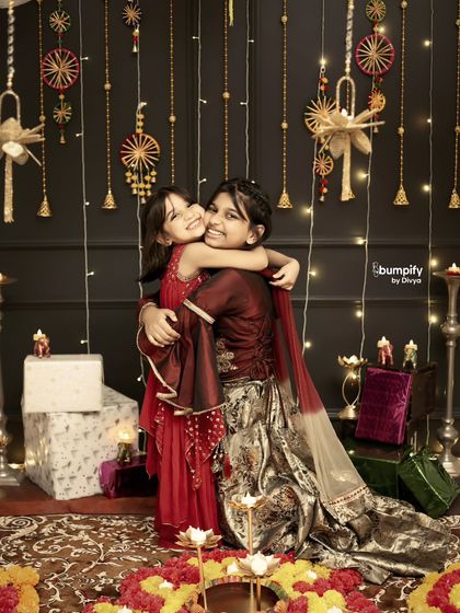 - Diwali kids photography setup - Diyas, fairy lights, flower rangoli, and warm tones for that perfect festive glow, works for solo or siblings.