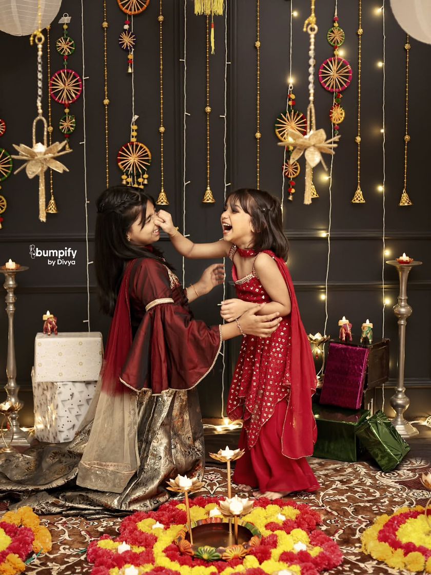 I capture the warm glow of Diwali with setups full of diyas, fairy lights, and flower rangoli. These sessions are perfect for individual portraits, sibling photos, or the whole family, preserving the joy and togetherness of the festival.