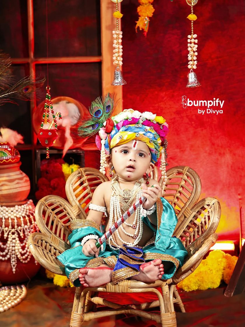 I create a magical Vrindavan in my studio for your little one. These sessions include full costumes for Krishna or Radha, and props like a flute, peacock feathers, and hanging matkis, available in multiple setups to capture that divine, playful spirit.