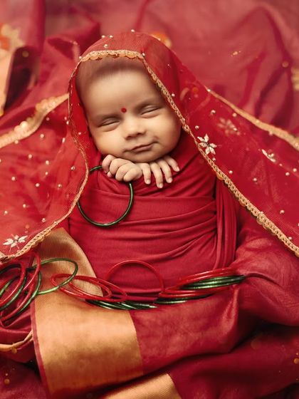 Your baby's first festival is a precious moment. I offer specialized newborn photoshoots with themes like Navratri, Saavan, or Punjabi cultural styles, using safe posing techniques and soft, beautiful props to create timeless, divine portraits.