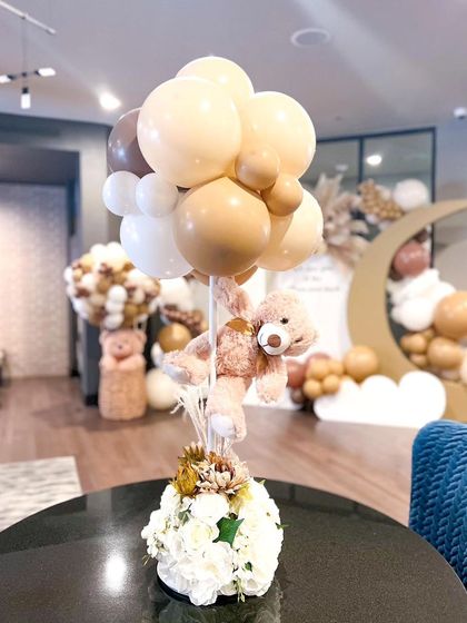 We specialize in creating Pinterest-inspired baby shower setups with themes like "Mom to Bee," "Baby in Bloom," and "On Cloud Nine." Our decorations feature pastel colors, elegant floral arrangements, and thematic props including teddy bears and hot air balloons.