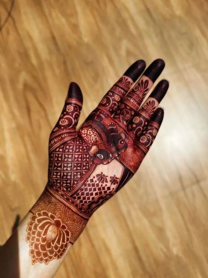I specialize in traditional Rajasthani mehandi, bringing my heritage to every piece. This includes detailed figurative work like bride and groom portraits, elephants, and architectural motifs like jharokhas.