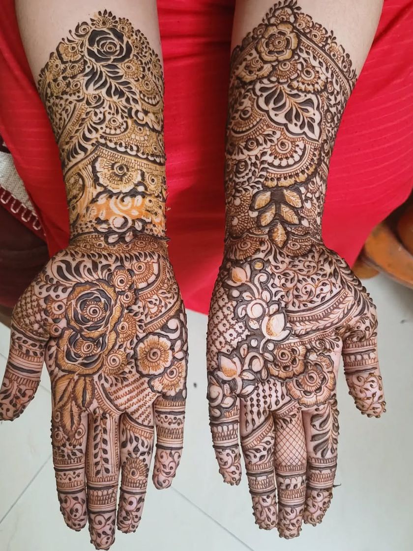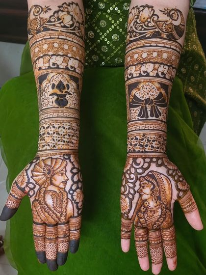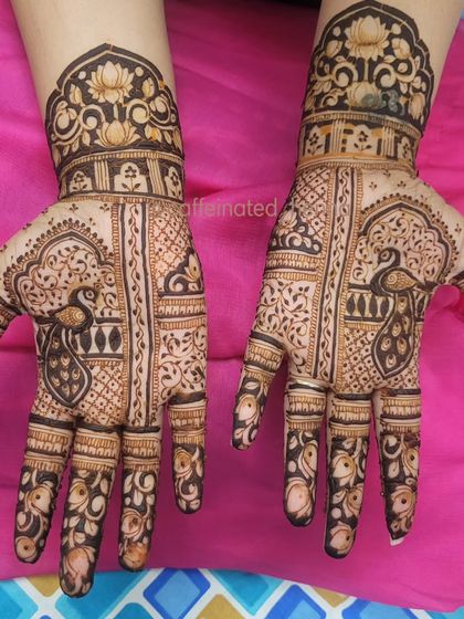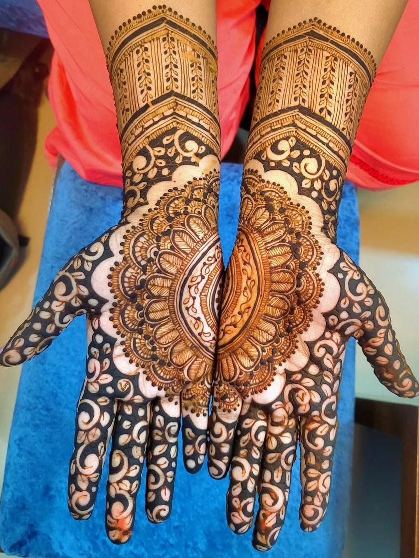 For the bride who wants the full, traditional experience. These designs are dense, intricate, and extend from the hands to the elbows, featuring classic motifs like florals, peacocks, and geometric grids.