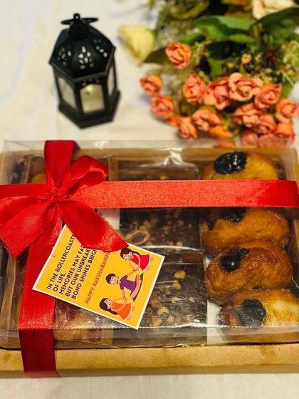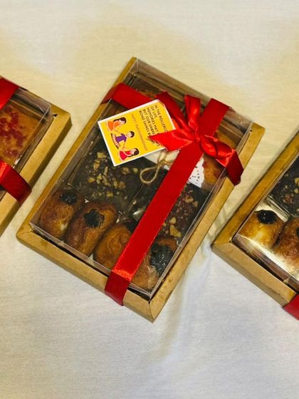 I create festive hampers for occasions like Diwali and Rakhi, featuring a curated selection of homemade treats. Each hamper includes dry fruit tea cake loaves, granola jars, and my signature sugar-free protein laddoos.