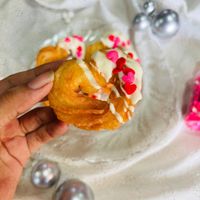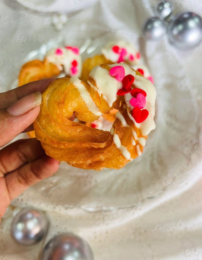 For something a little different, try my crispy, handmade heart-shaped churros. I drizzle them with white chocolate and finish them with festive sprinkles, making them a unique and delightful treat for any special occasion.