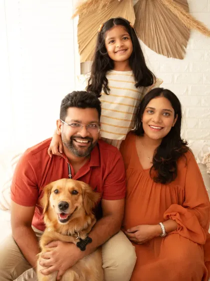 I do classic studio portraits with clean backdrops and coordinated outfits, or we can go outdoors for a candid family photoshoot in Delhi NCR parks and gardens. If you want your dog in the picture, bring them along - pets are family too.
