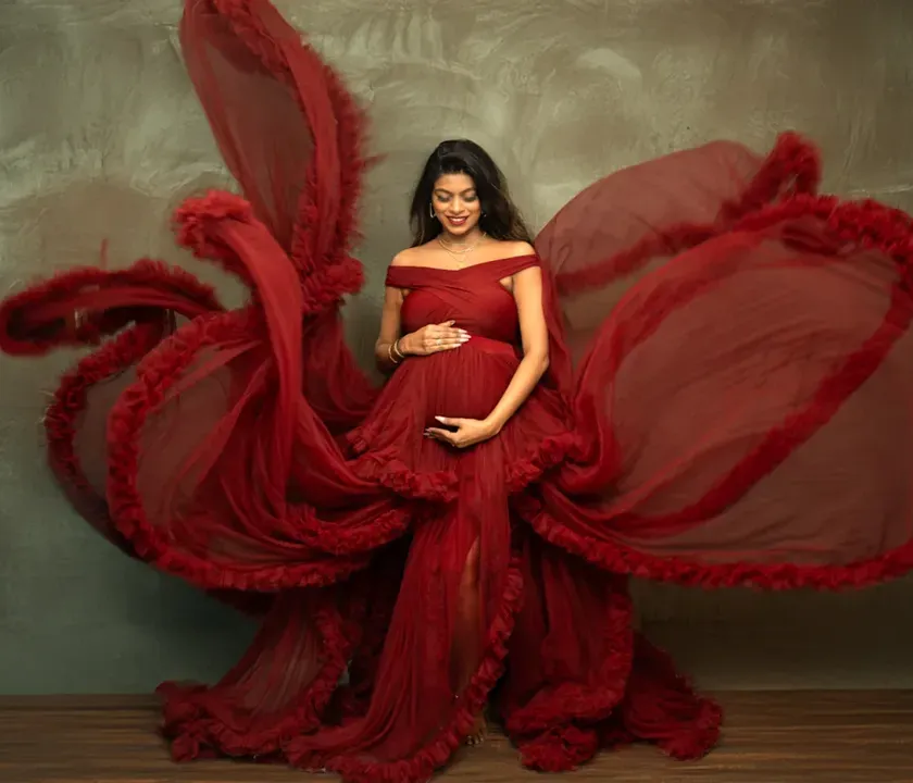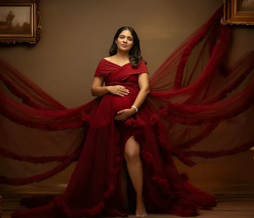 Feel like a queen in one of my stunning, flowing gowns. These studio sessions are designed to be dramatic and elegant, using beautiful fabrics in rich colors like red, brown, and green to create unforgettable, magazine-worthy portraits.