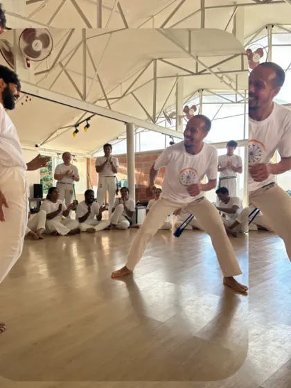We run Capoeira workshops for teams where everyone learns basic moves, plays music, and connects through group activities—no experience needed, and it’s nothing like regular team building.