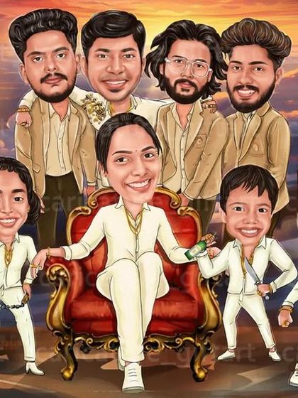 - Family or team caricature art online, including wild stuff like superhero office teams or a Kerala bus trip scene.