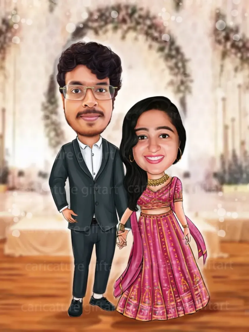 This is my most popular service. I create custom couple caricatures for weddings, engagements, and anniversaries that you can use for invitations, save-the-date cards, or as a special gift. I can illustrate you in traditional attire like a Kerala saree and mundu, a suit and gown, or any other theme you have in mind.