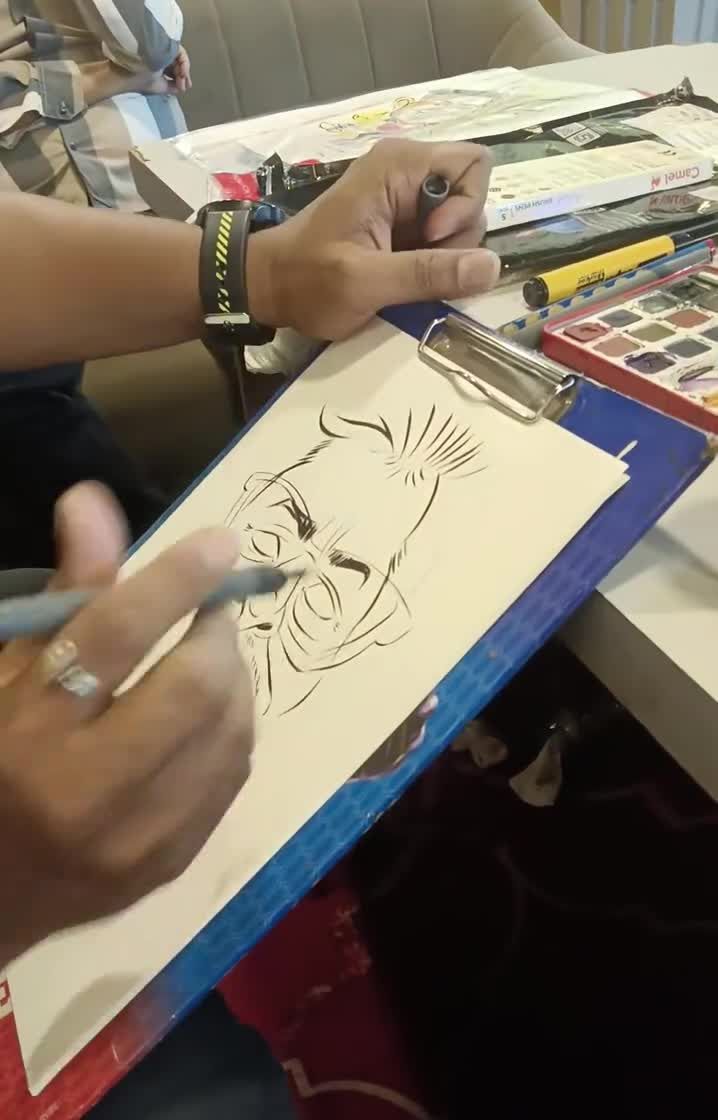 See how a blank page transforms into a lively caricature. I use professional markers and watercolors for my classic sketches, focusing on capturing a fun likeness in just a few minutes.
