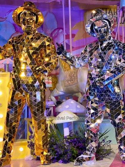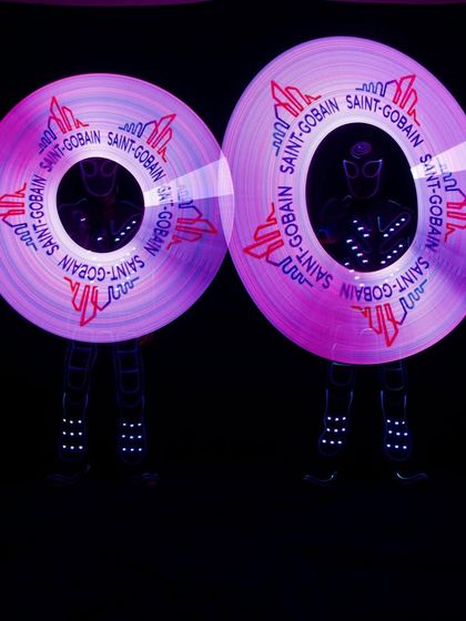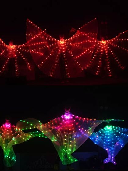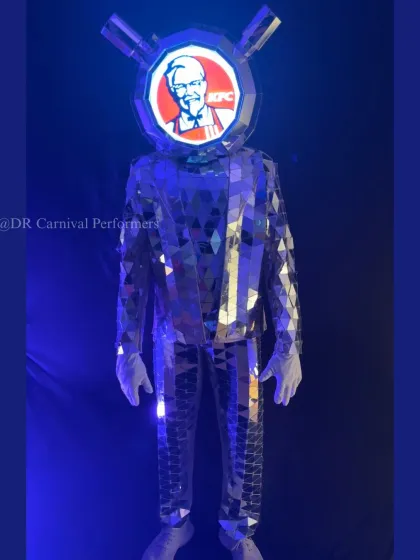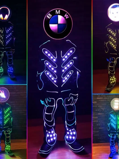 We perform LED Tron dances, Mirror Man acts, custom hologram shows, and LED prop routines with options to display your logo or message for events.