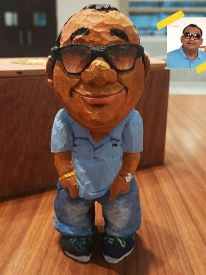 I hand-carve custom wooden figurines from your photos, capturing personal details and memories in each piece, all made in my Kolkata studio and shipped worldwide.
