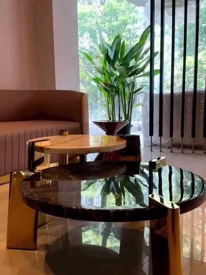My collection of tables includes everything from large, room-anchoring center tables to elegant side tables and functional consoles. I work with diverse materials like Italian marble, teak wood, and resin, often combining them with PVD coated steel bases in gold, rose gold, or graphite grey for a bespoke finish.
