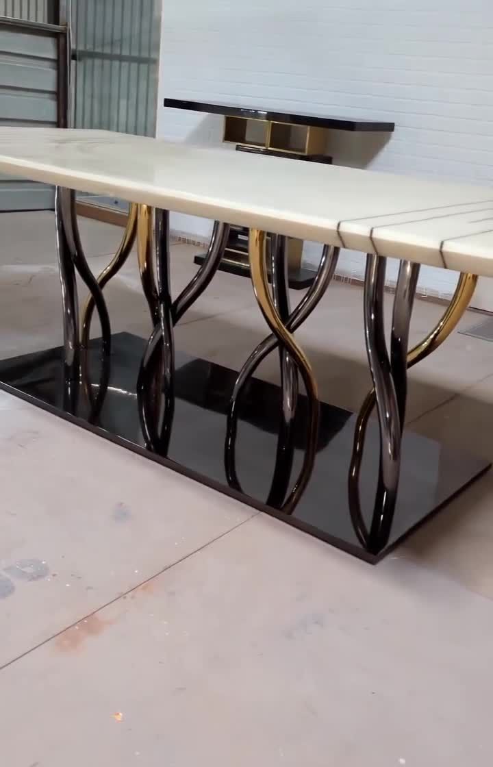 My tables are designed to be the heart of the room. I combine sculptural metal bases, finished with durable PVD coatings like matt gold or gun metal, with premium tops such as Italian marble to create bespoke dining and accent pieces.