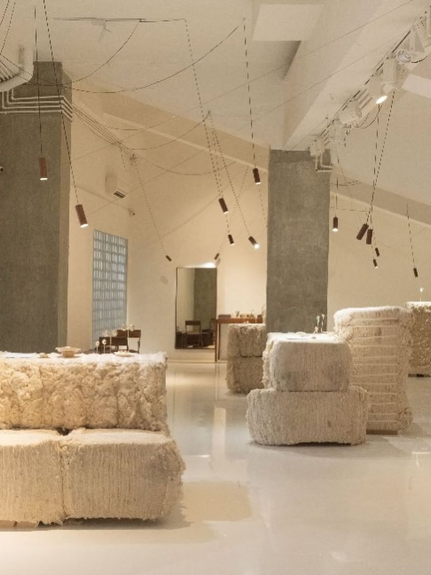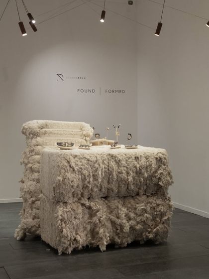 Our design thinking extends beyond buildings to the scale of curated experiences. For Studio Renn's jewelry exhibitions, we created transient landscapes using unconventional materials like raw cotton bales to explore the relationship between the primal and the precious.