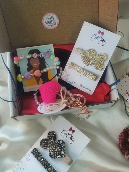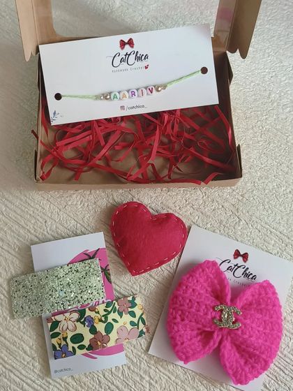 We make handmade hair clips, headbands, and bridal gajras with custom names and themes for all ages, plus organizers to keep everything tidy.