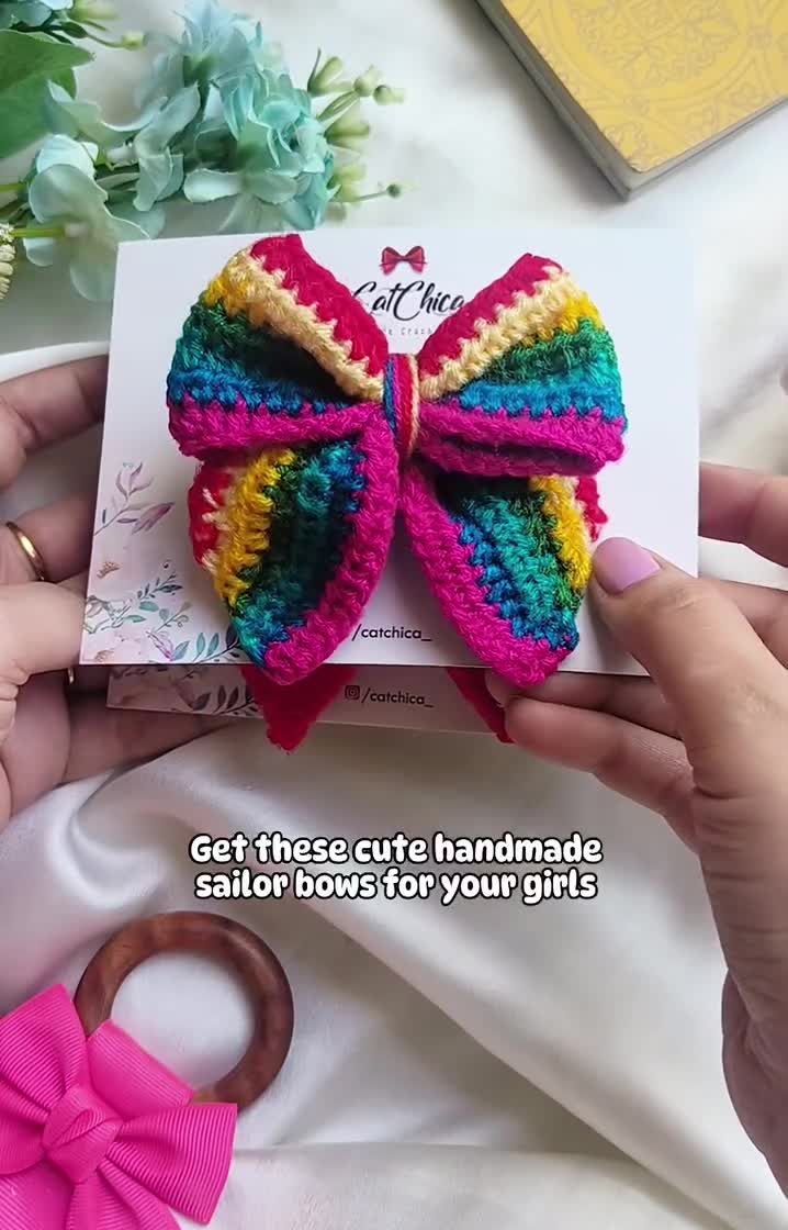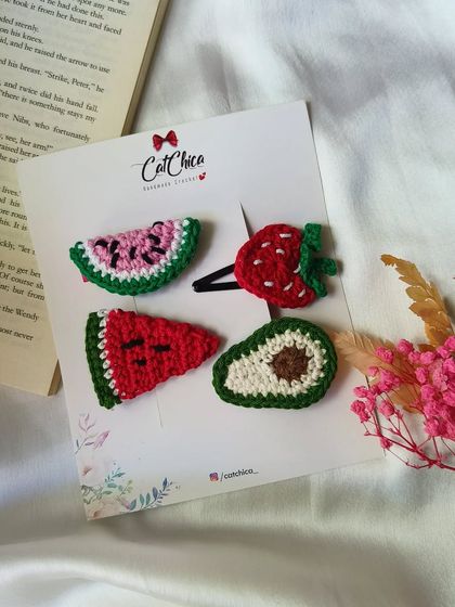 Add a touch of fun with our collection of handmade crochet clips. This includes our popular Sailor Bows in various colors, as well as playful themes like fruits, rainbows, stars, flowers, and cute characters.