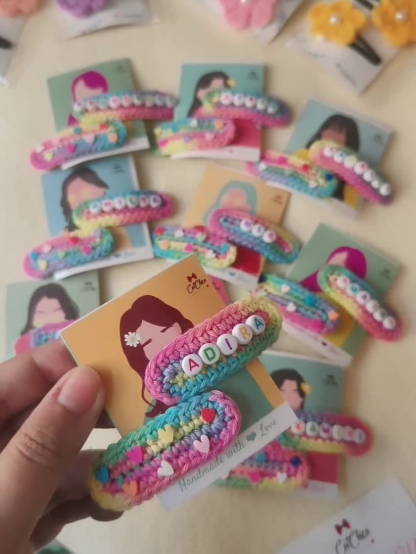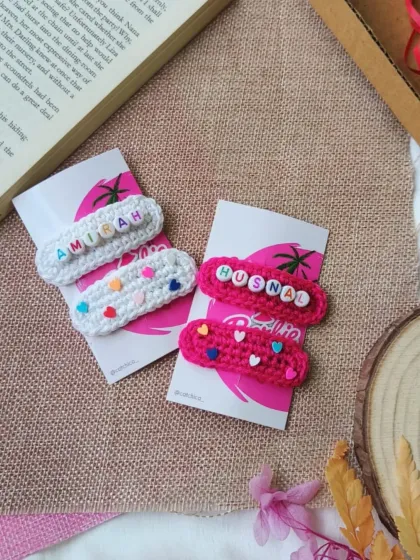 Our most-loved creation! Each clip is crocheted by hand and customized with your name using colorful beads. They are a perfect personal gift and a very popular choice for birthday party return favors.