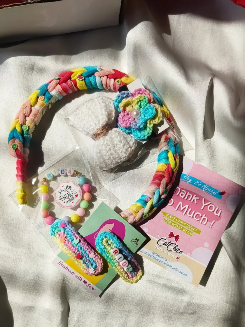 Find the perfect present for birthdays, baby showers, Eid, or just because. We create beautiful, personalized hampers that include a mix of our handmade accessories, and we can also prepare bulk orders for return gifts.