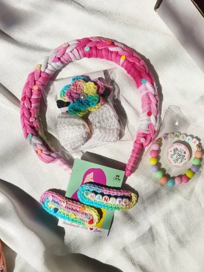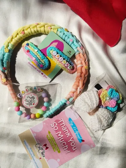We create customized gift collections featuring our handmade crochet accessories. Each hamper includes hair bands, clips, bracelets, and hair ties, thoughtfully curated with vibrant designs and personalized touches like name customizations.