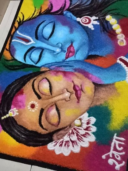 This is where I pour my heart into the art, creating detailed portraits of deities like Radha-Krishna and Ganesha. These intricate, freehand designs are made with colored powders to bring a spiritual and artistic focus to your celebration.