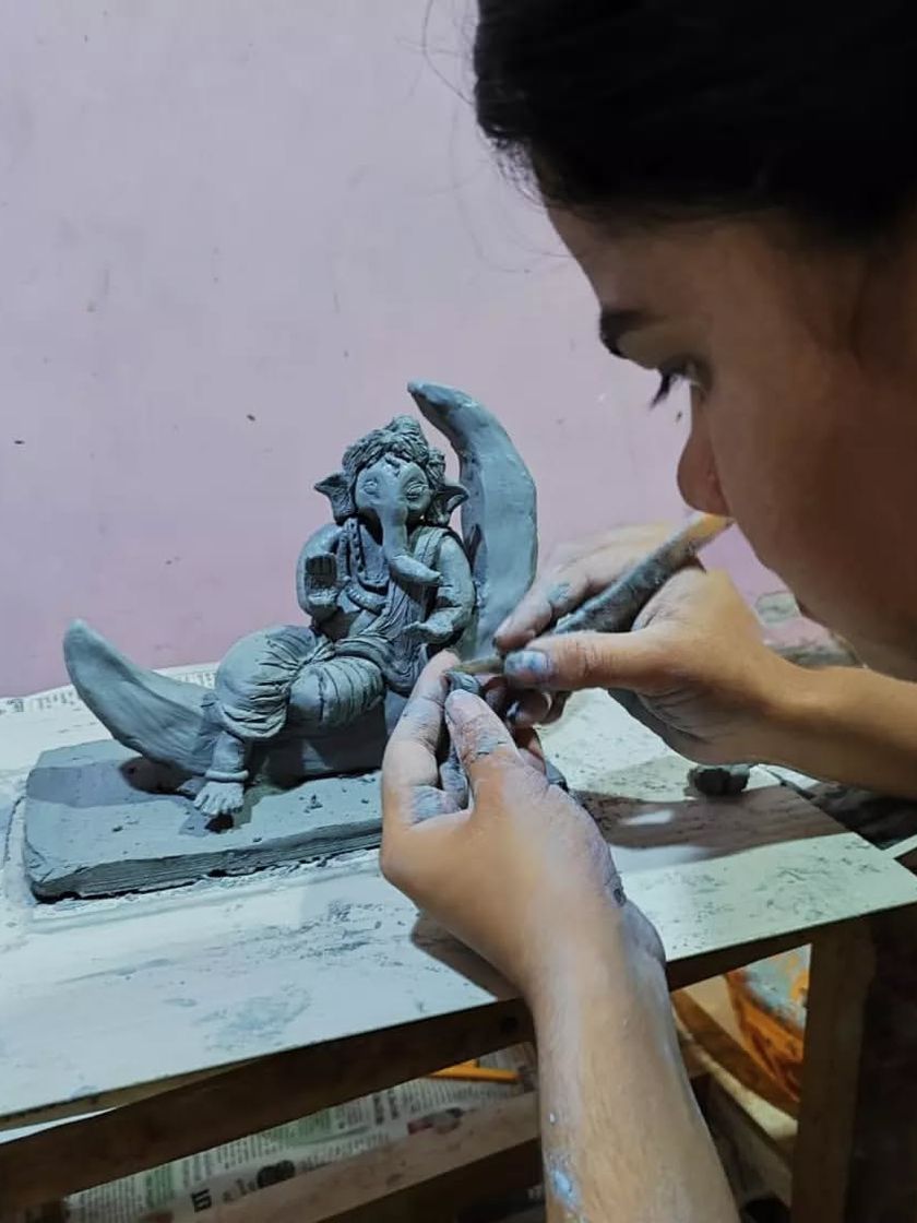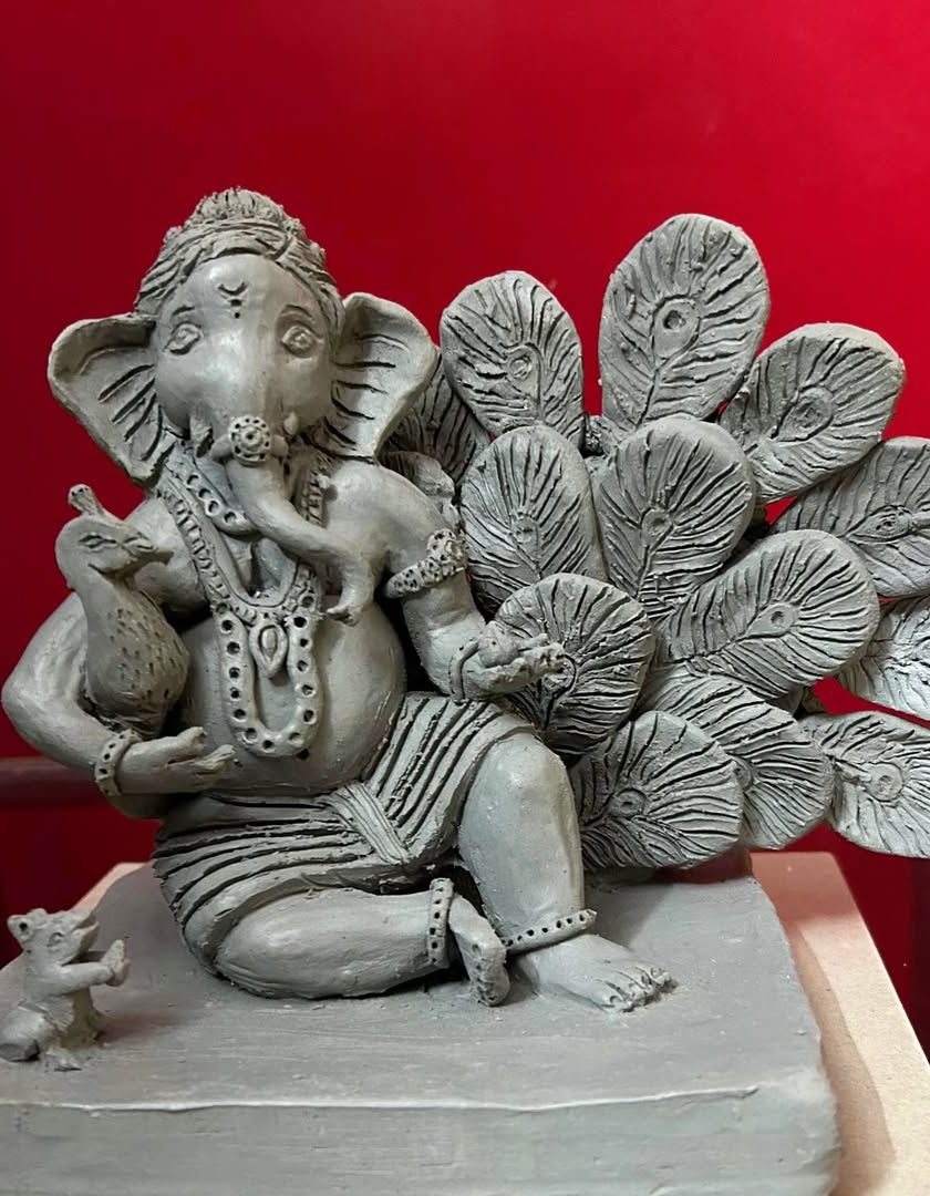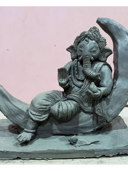 I create unique, commission-based Ganesha idols from Shadu clay. Each piece, like the 'Bappa on a Moon' or the 'Mayur Pankh Ganesha', is designed to your vision and sculpted entirely by hand.
