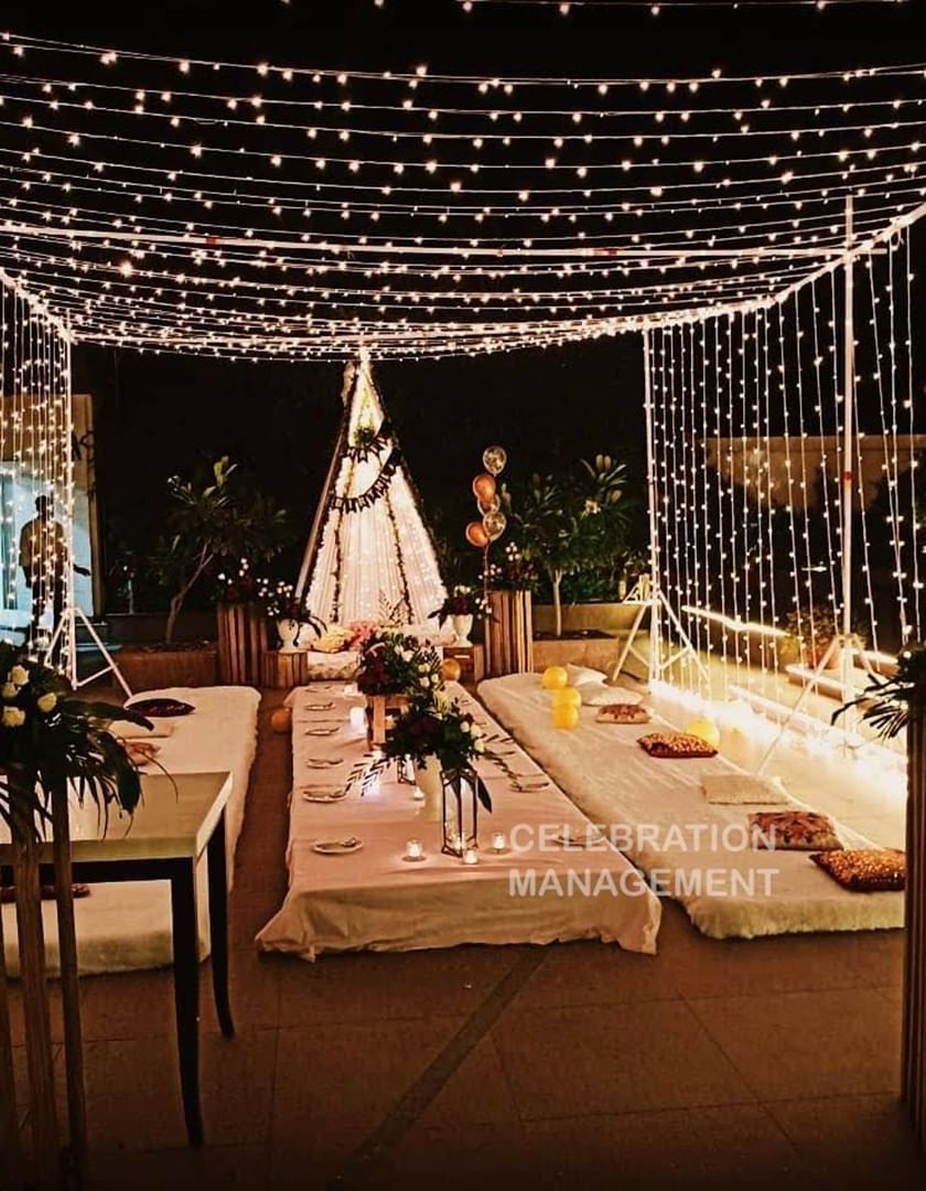 We transform terraces and outdoor spaces into enchanting settings for a private dinner or celebration. This setup features a canopy of fairy lights, low seating arrangements for a bohemian-chic vibe, and a cozy teepee tent.