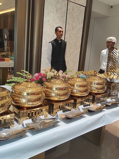 You’re not just getting food - we set up the full buffet with gold-finish chafing dishes, bring all the crockery (eco-friendly options too), and provide uniformed staff so you can just chill at your own event. Our premium live food counters are a hit - think Chaat, Dimsum, Pav Bhaji, and Waffles, all made fresh and interactive.