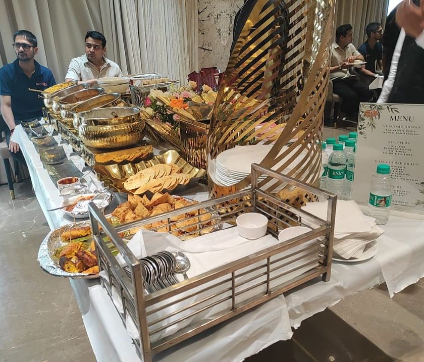 Our service includes a complete buffet setup with elegant gold-finish chafing dishes, all necessary crockery, and uniformed staff. We handle everything from setup to service so you can relax and enjoy your event.