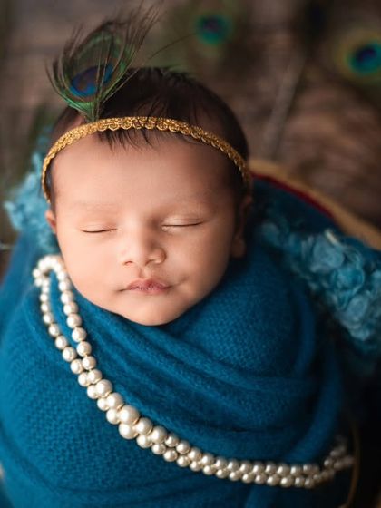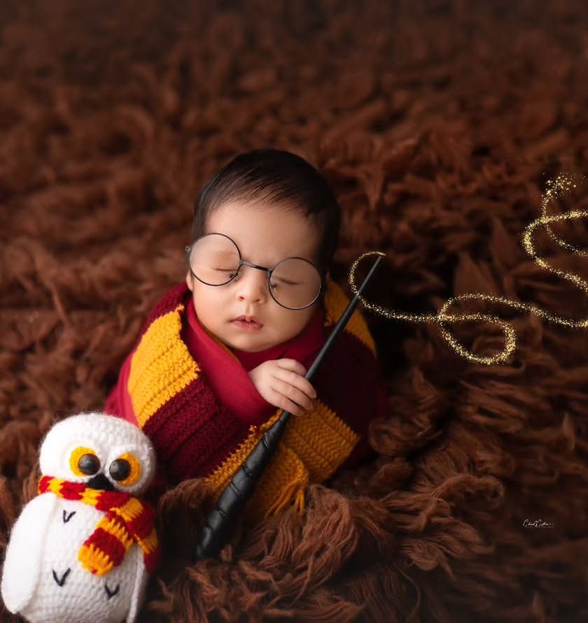 Let's bring your imagination to life with a unique, themed photoshoot. My studio is a treasure trove of custom props and outfits for themes like Harry Potter, Little Krishna (Janmashtami), and festive holiday scenes. I also create whimsical setups with celestial moons, cute animals, and fun characters to make your baby's first portraits truly one of a kind.