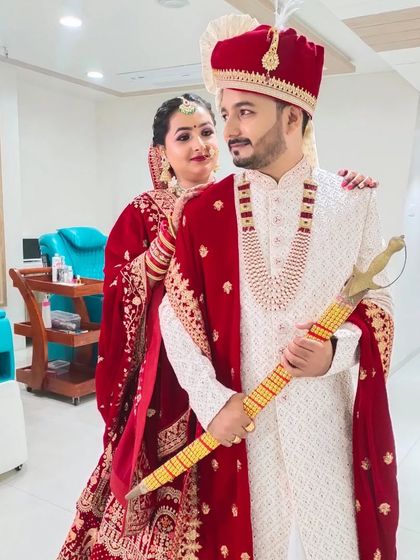 I do natural groom makeup and hair styling so you look clean, matte, and like yourself in your wedding photos, plus I help with your sherwani and stole draping.