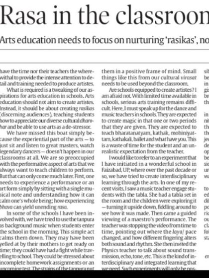 I believe art should be everywhere - in classrooms, offices, and in daily life. My focus is on holistic arts education, breaking down barriers between subjects and making creativity part of how we learn. It's not only about making new performers, but also nurturing rasikas (those who truly enjoy and understand art). That’s what builds a cultured community.