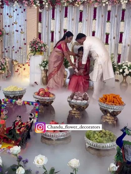 - Floor Decor: Flower petal rangoli (pookalam) style border near the backdrop.