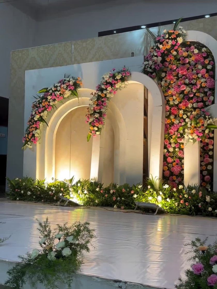 We create stunning backdrops for your reception or engagement, from modern pastel themes with dramatic lighting to classic floral arches. We also handle special effects like fog for a grand entry.