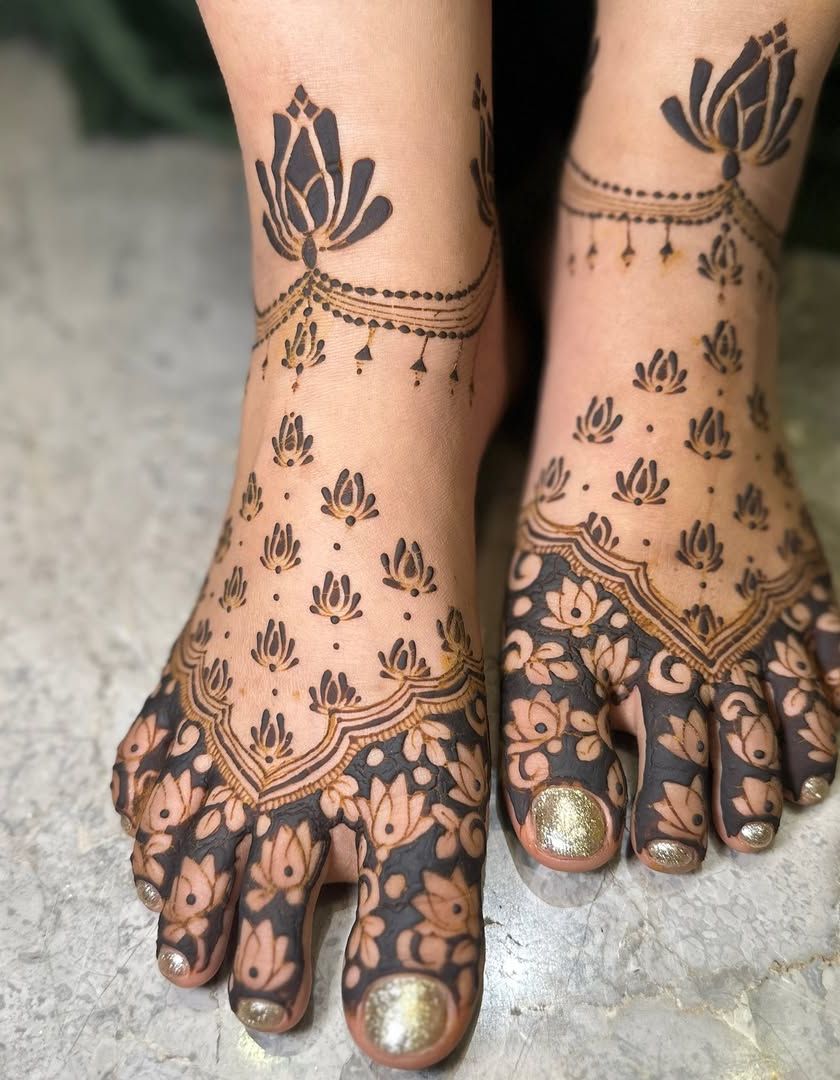 Don't let your hands have all the fun. I design beautiful mehendi for your feet that complements your hand designs, from simple and elegant patterns to full bridal coverage. It’s the perfect finishing touch for your bridal look.