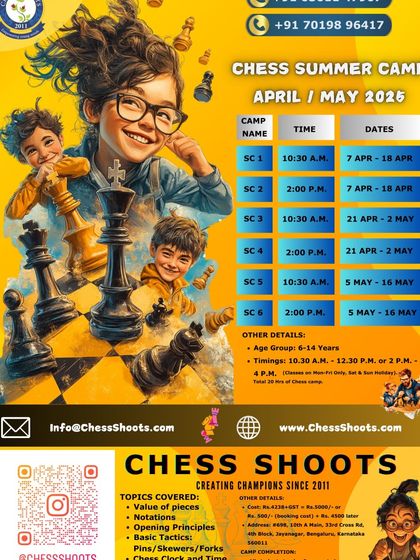 We run a 2-week summer chess camp for kids aged 6 to 14, with small groups, FIDE-rated coaches, and a tournament at the end so every child learns and competes.